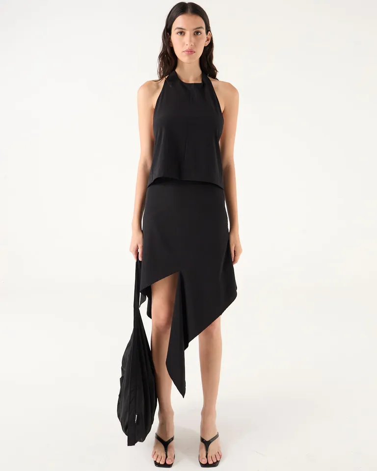 Top de estilo halter con escote redondo y diseño de espalda descubierta. Presenta tiras para anudar en el escote y en la parte posterior, con un calce holgado que llega hasta la cadera, ofreciendo un estilo moderno y versátil para diversos outfits.