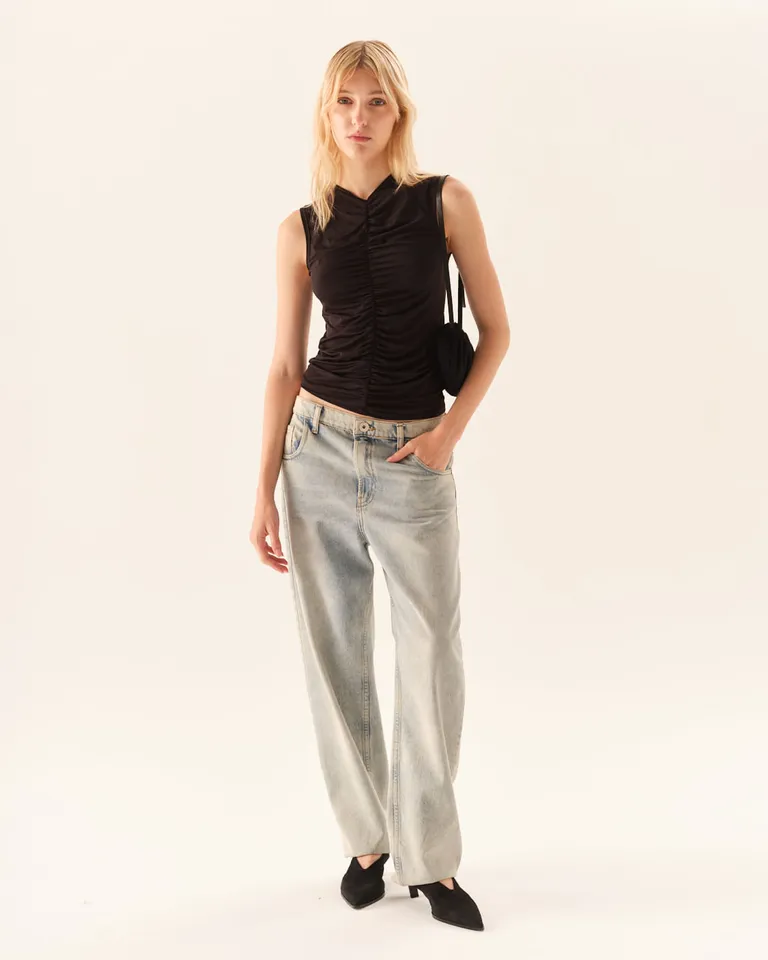 Top sin mangas confeccionado en tejido de punto, con escote en V y detalle de fruncido central en el delantero. Presenta un calce regular que se adapta a diversas ocasiones, ideal para completar un outfit versátil y contemporáneo. Su diseño sencillo y elegante lo convierte en una prenda básica y funcional para el uso diario en cualquier temporada.