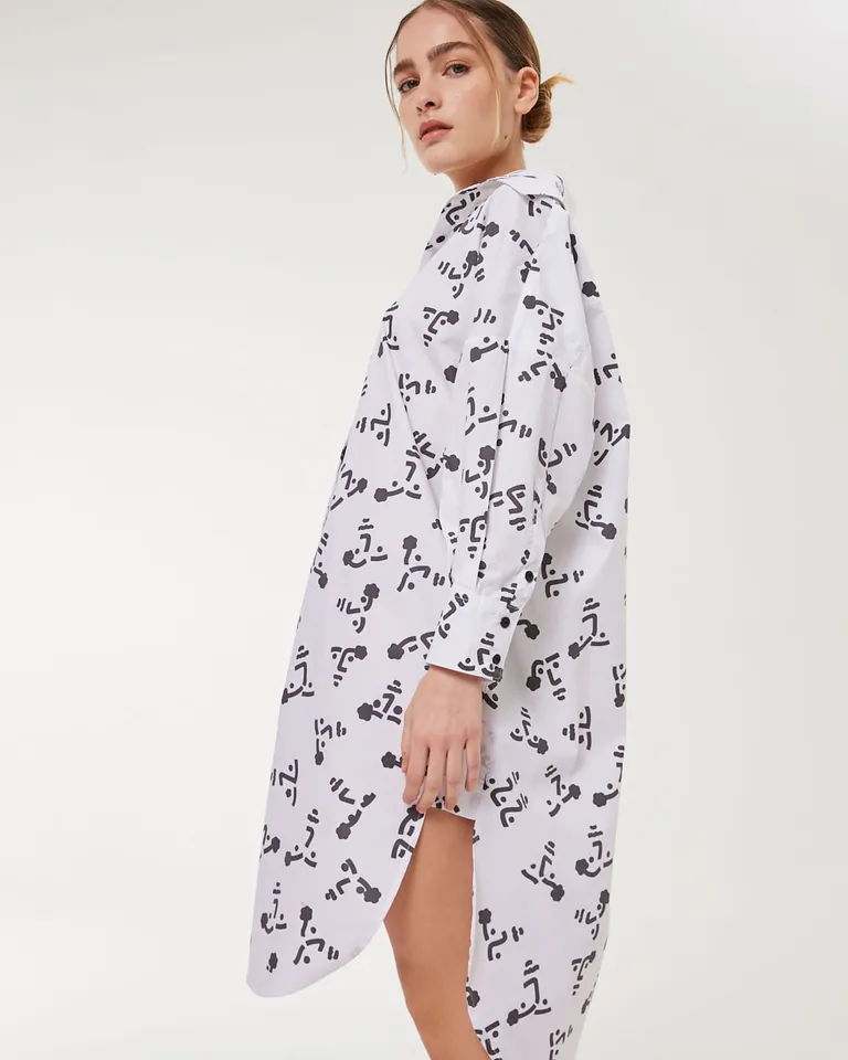 Vestido camisero con diseño estampado, de calce amplio y relajado. Presenta un corte largo con tajos laterales y detalle de cuello camisero clásico. Una prenda versátil, ideal para lograr un estilo casual y cómodo en el uso diario. El diseño incluye aberturas laterales y un largo que llega por encima de la rodilla, ofreciendo una caída fluida que se adapta a diversas ocasiones.