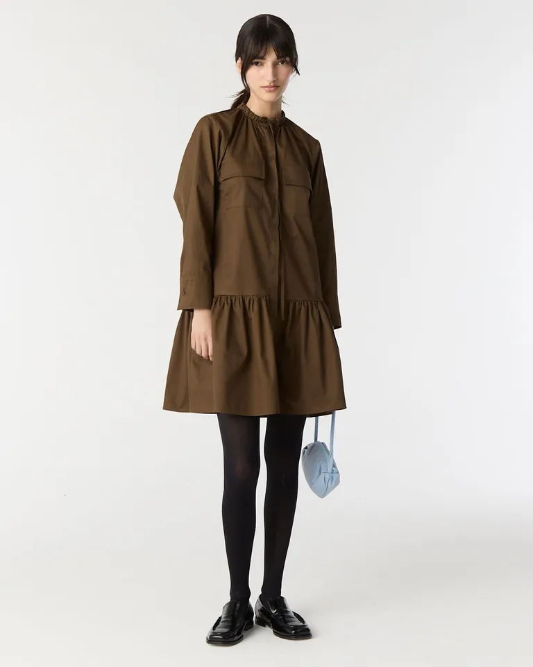 Vestido corto de diseño camisero con cuello fruncido y detalle de volado en el ruedo. Presenta un corte amplio y cómodo, con botones ocultos en la parte delantera y mangas largas. Ideal para un estilo versátil y femenino en el día a día.