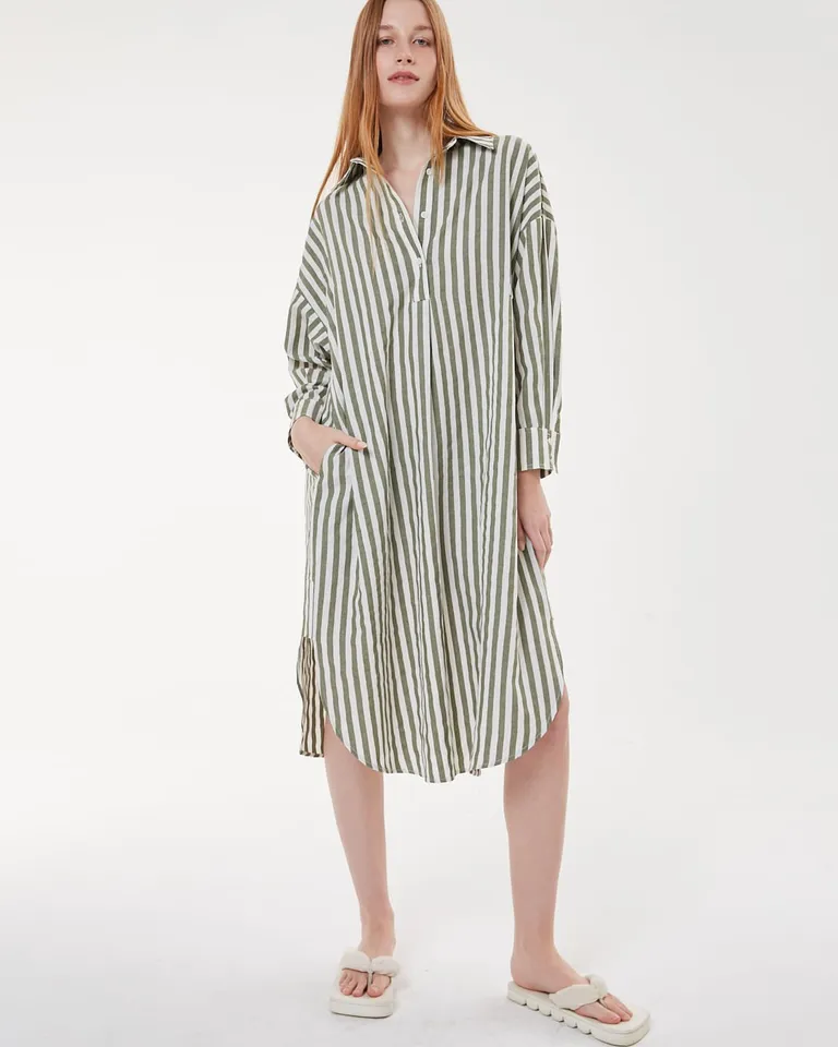 Vestido tipo túnica con diseño de rayas verticales, cuello camisero con botones y mangas largas. Presenta un corte holgado, ruedo curvo con tajos laterales y prácticos bolsillos laterales. Una opción versátil y cómoda para usar en diversas ocasiones durante el día.