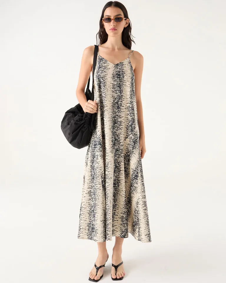 Vestido midi con diseño estampado de líneas verticales, confeccionado con breteles finos regulables y un corte holgado que aporta movimiento natural. Cuenta con aberturas laterales en el ruedo que ofrecen mayor comodidad y una caída fluida, ideal para usar en diversos momentos del día. Una prenda versátil y ligera para renovar el guardarropa de temporada.