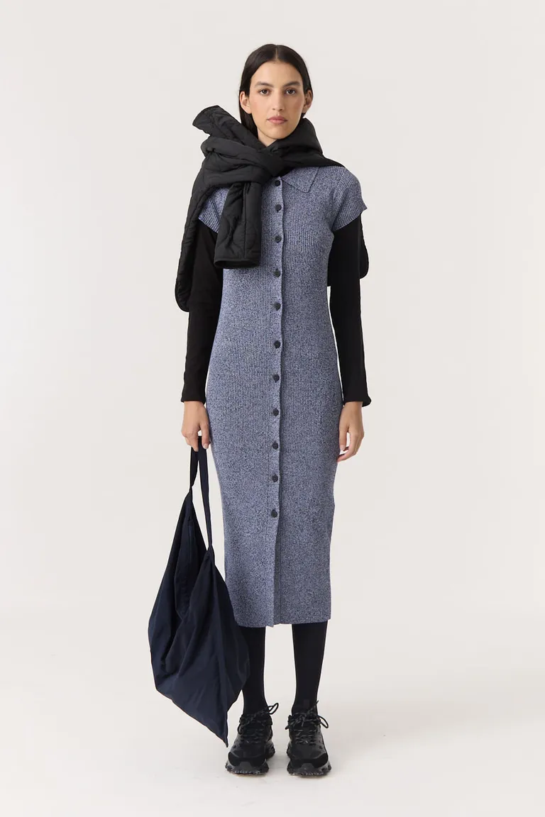 Vestido tejido de largo midi con cuello camisero y cierre frontal por botones. Presenta una silueta entallada al cuerpo que aporta un estilo versátil y sofisticado. Ideal para combinar en diferentes ocasiones con un diseño atemporal y funcional.