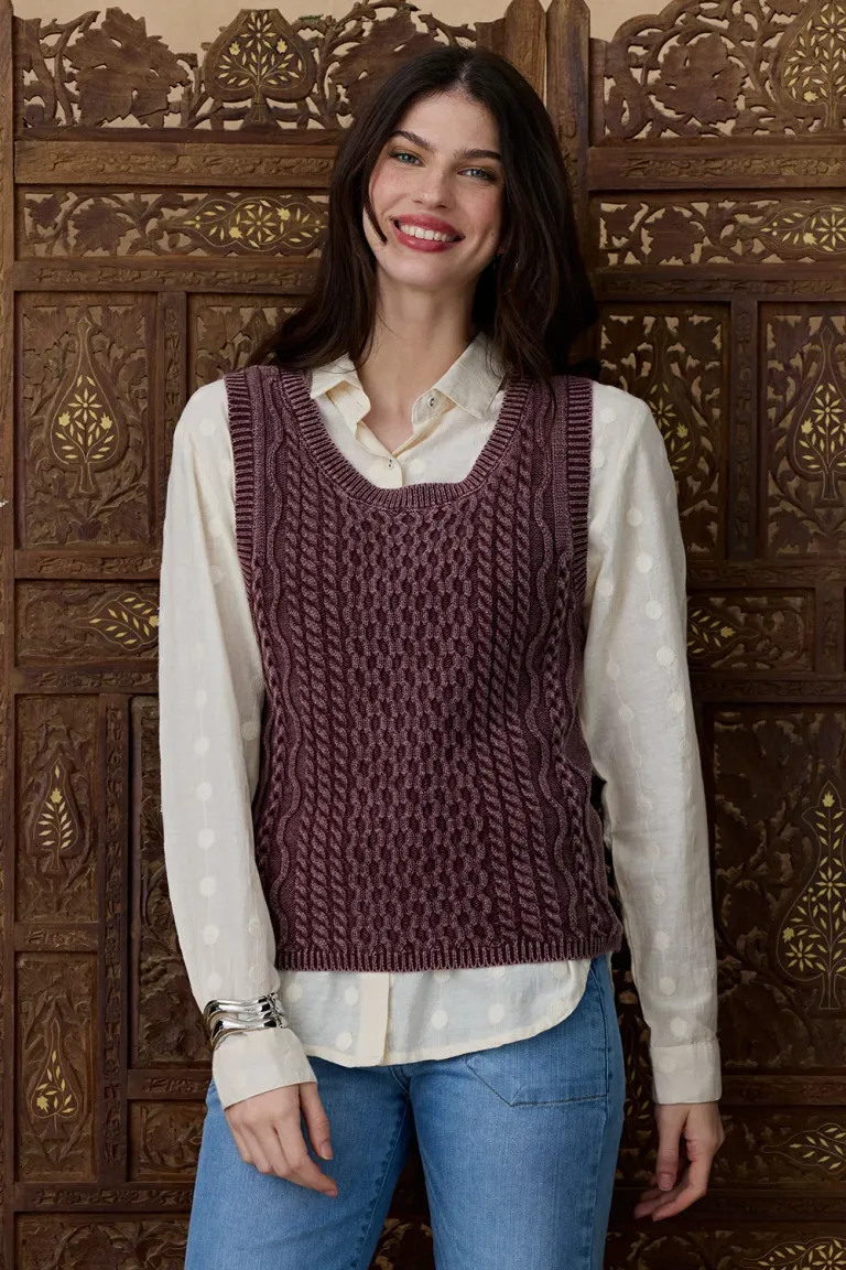 Chaleco tejido con diseño de texturas en relieve y cuello redondo. Es una prenda versátil ideal para combinar en capas sobre camisas o remeras, logrando un estilo clásico y confortable para el uso cotidiano.
