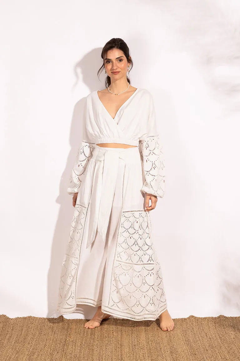 Pantalón de diseño amplio y holgado, con detalles de calados y bordados en la parte inferior. Incluye cintura elástica y lazo frontal ajustable para un calce cómodo. Una prenda versátil ideal para crear conjuntos frescos y con estilo.