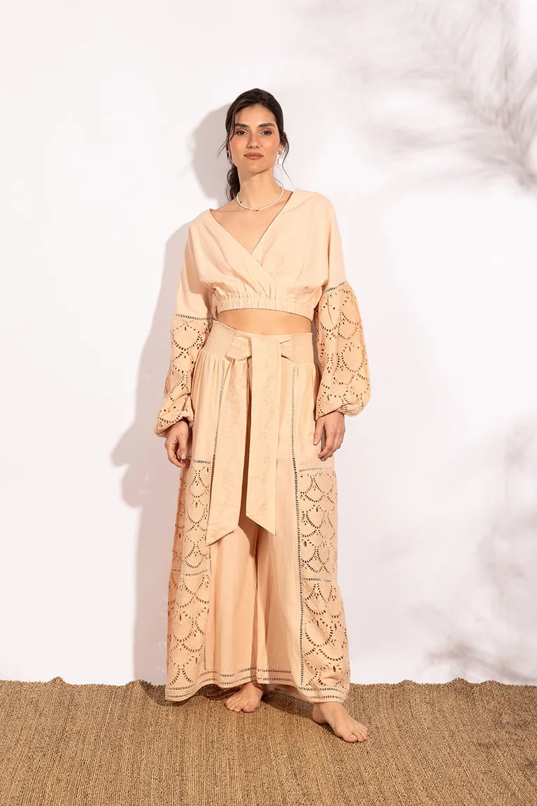 Pantalón de corte amplio y holgado con un diseño único de calados y bordados. Presenta una cómoda cintura elástica y un detalle de lazo frontal que aporta distinción. Ideal para un look fresco y relajado durante los días de verano.