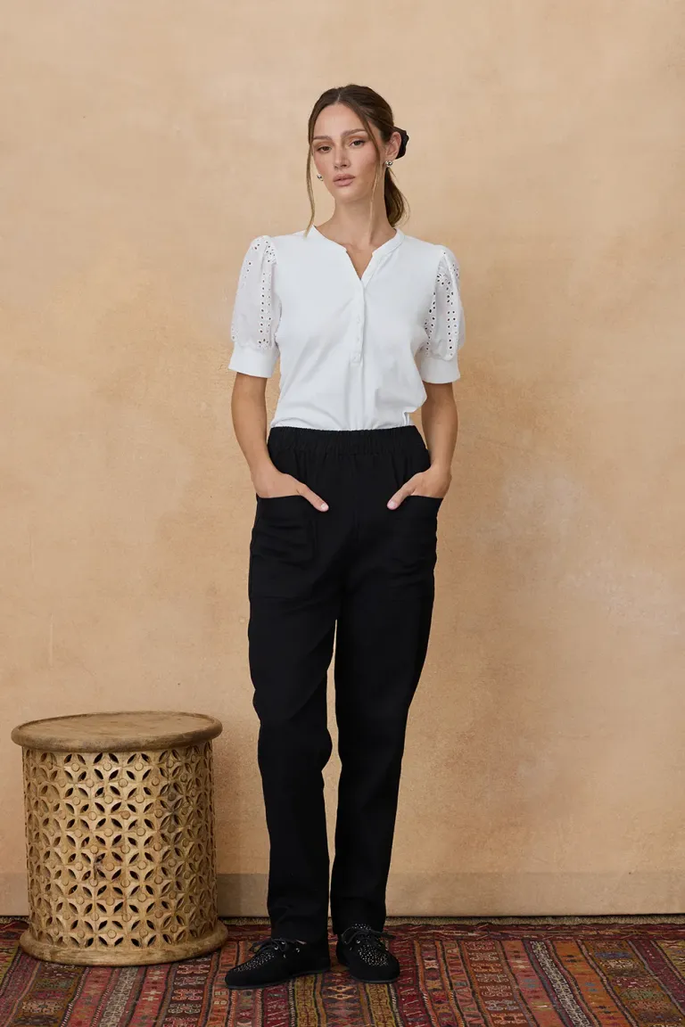 Pantalón de corte cigarette con cintura elastizada y bolsillos frontales. Un diseño versátil y cómodo ideal para el uso diario, combinable con diferentes estilos para lograr looks urbanos y modernos.