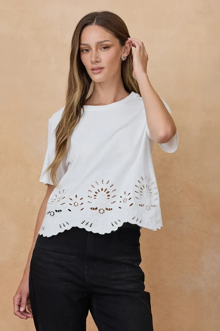 Remera de mujer con mangas cortas y detalle de calado artesanal en el ruedo de Indiastyle