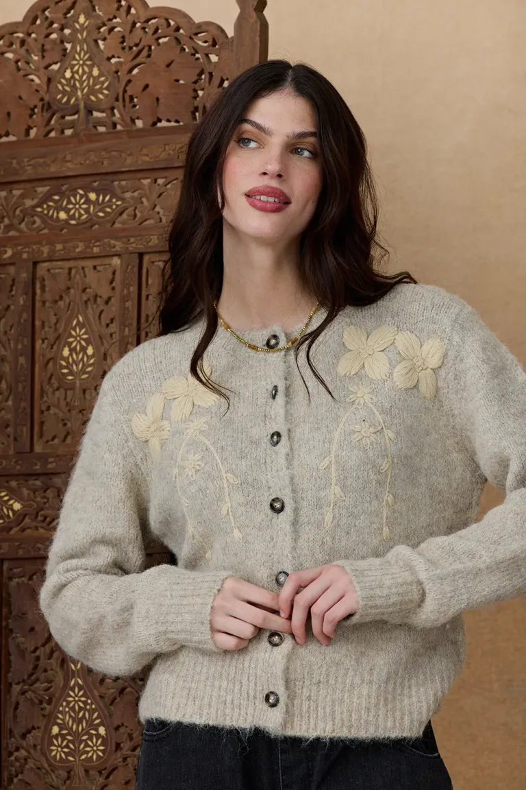 Saco tejido con cierre frontal de botones y detalles de flores bordadas sobre la parte superior. Esta prenda de diseño clásico cuenta con puños y cintura terminados en tejido acanalado, ideal para completar equipos informales con un toque femenino y delicado.