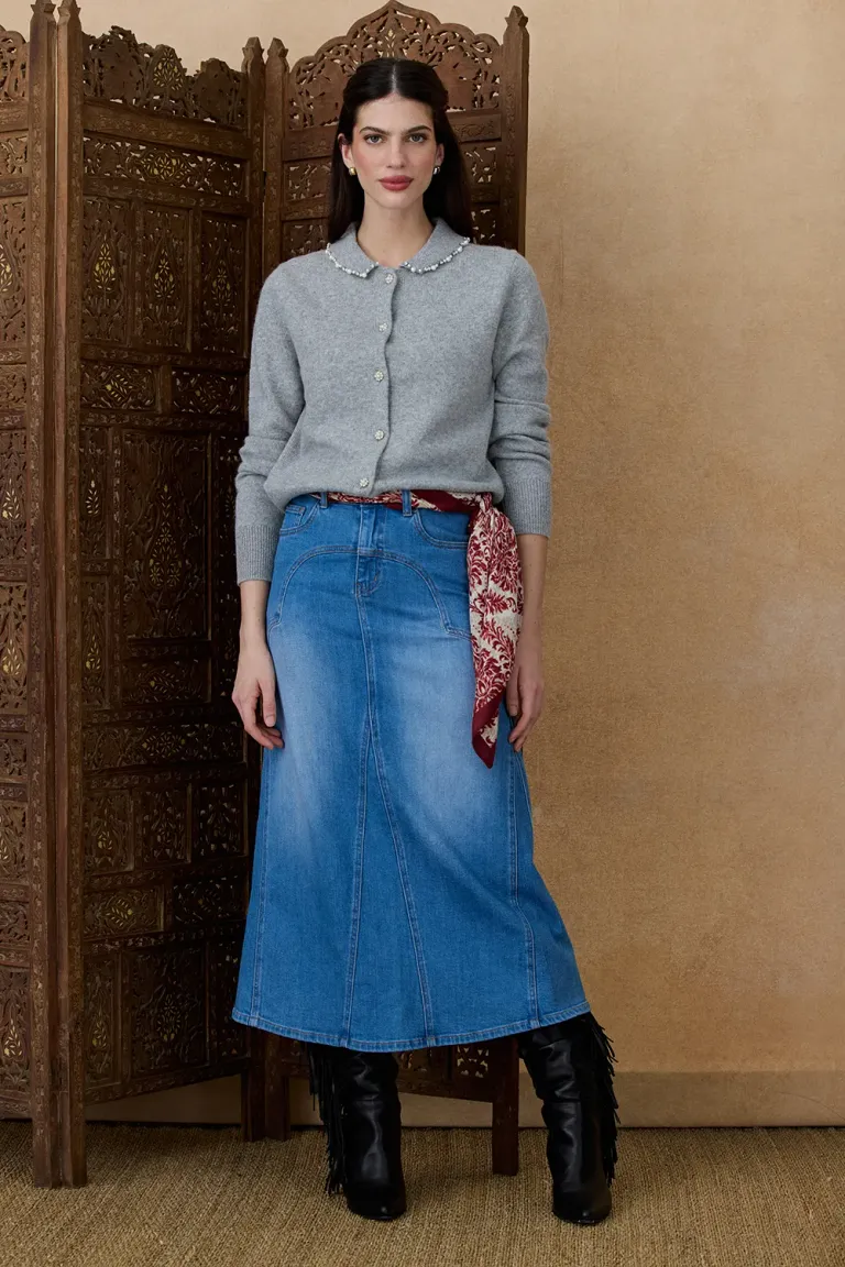 Saco tejido con cierre frontal de botones y detalles ornamentales de perlas aplicadas sobre el cuello. Una prenda versátil ideal para completar conjuntos de media estación, ofreciendo un ajuste cómodo y un estilo clásico.
