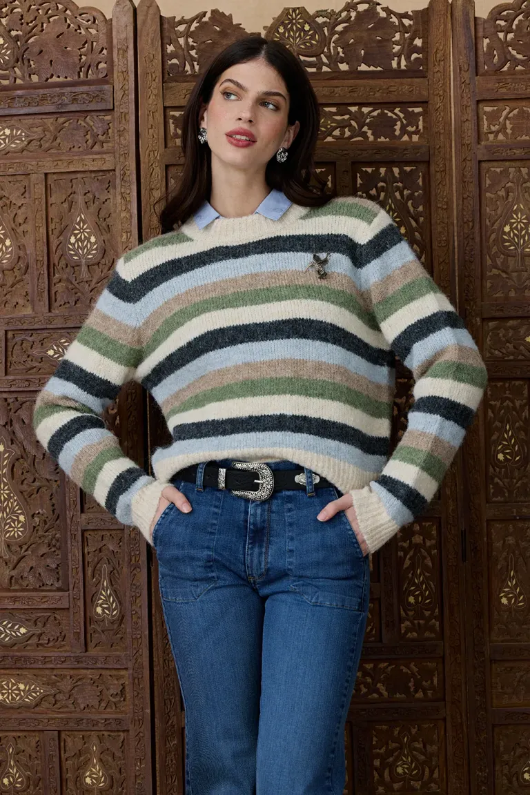 Sweater tejido con diseño de rayas horizontales y cuello redondo. Presenta un estilo clásico con ajuste cómodo y mangas largas, ideal para combinar en diferentes ocasiones durante los meses de clima fresco.