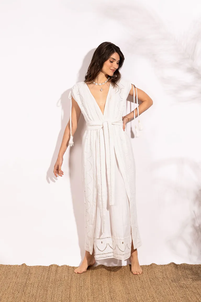 Vestido largo con diseño de kaftán, escote pronunciado y detalle de ajuste en la cintura con lazo. Presenta aberturas laterales en la falda y delicados bordados a lo largo de la prenda, ofreciendo una opción ideal para ocasiones especiales durante el verano. Su diseño fluido y femenino permite un calce relajado y sofisticado.