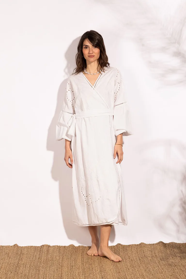 Vestido midi de diseño cruzado con detalles de bordado y calados. Presenta un corte fluido, escote en V y mangas largas con volumen. Incluye un cinturón ajustable que permite entallar la prenda según la preferencia. Una pieza versátil y fresca, ideal para lograr un estilo sofisticado y cómodo en diversas ocasiones.