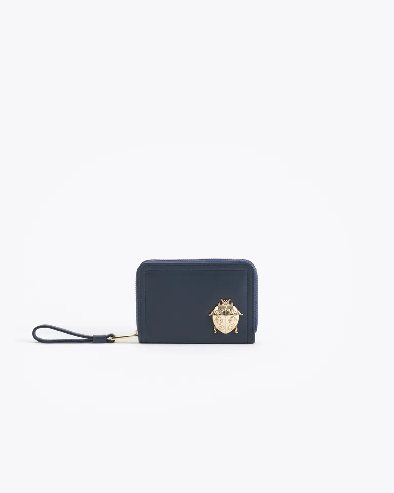 Billetera compacta de diseño funcional con aplique decorativo metálico en el frente. Cuenta con cierre perimetral seguro y correa de mano integrada, ofreciendo una solución práctica para organizar tarjetas y billetes. Su formato pequeño facilita el traslado en carteras o bolsos de mano sin ocupar espacio excesivo.