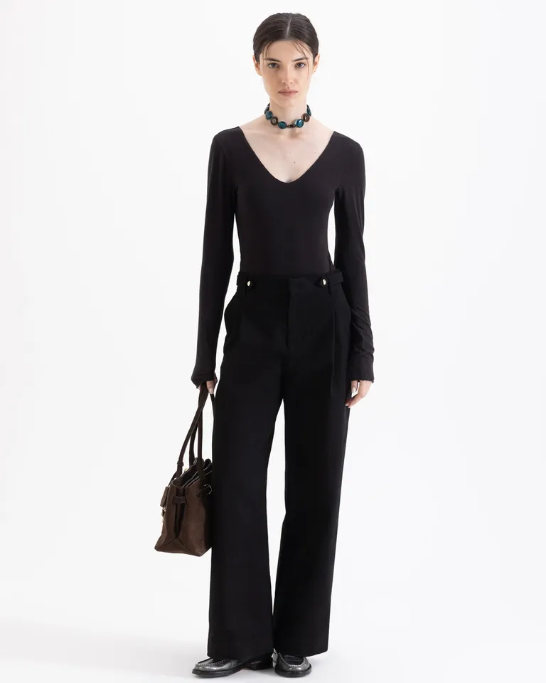 Body de manga larga con escote en V profundo. Presenta una silueta ajustada y diseño minimalista ideal para combinar en diversos conjuntos. Cuenta con detalle de logo en la parte posterior. Una prenda esencial versátil para el guardarropa diario.