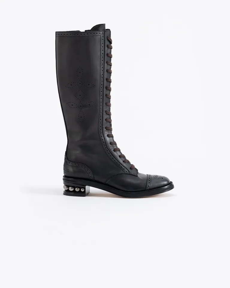 Bota de caña alta con ajuste mediante cordones frontales y cierre lateral. Presenta un diseño clásico con detalles de perforaciones decorativas y un taco bajo adornado con esferas metálicas. Un calzado versátil ideal para completar diversos conjuntos con un toque distintivo.