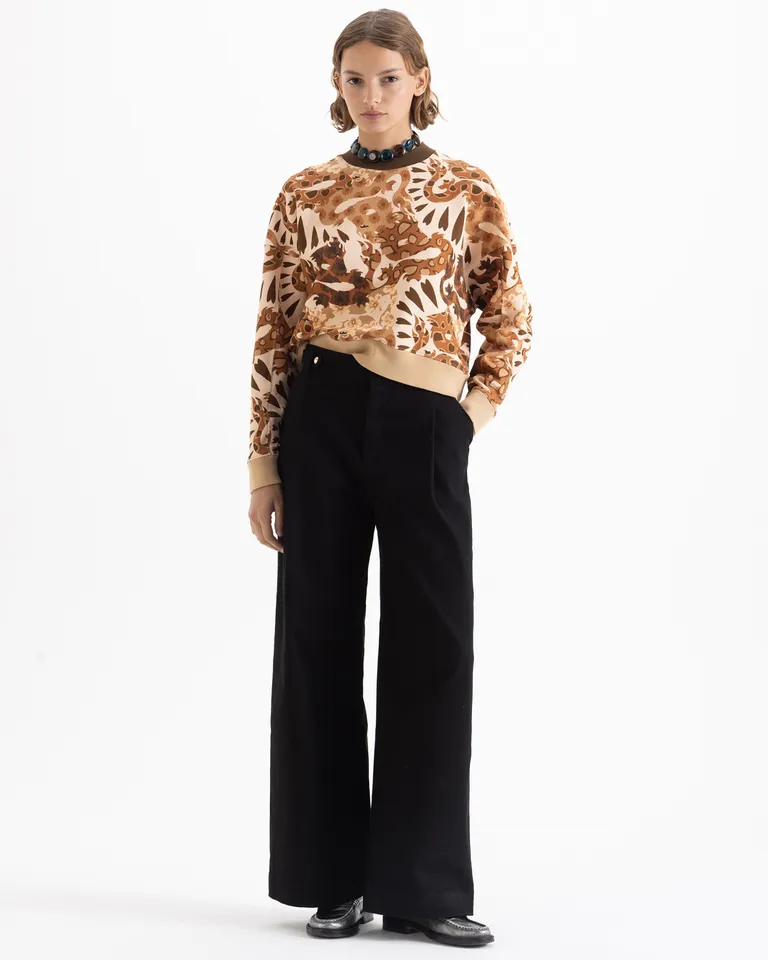 Buzo con estampa integral, diseño de mangas largas y cuello redondo con detalles en tejido. Presenta un calce amplio y relajado, ideal para completar equipos informales de uso diario. El diseño cuenta con terminaciones tejidas en puños y cintura, manteniendo una estética versátil y cómoda.