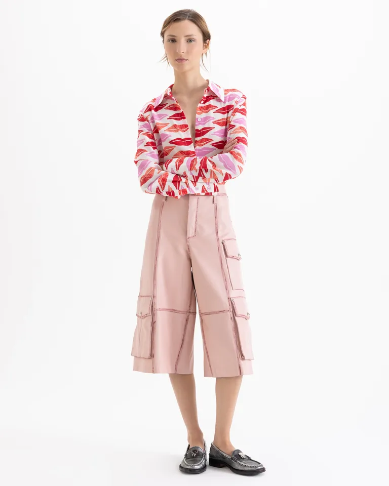 Camisa de corte clásico con estampa llamativa de labios. Presenta cierre frontal oculto, cuello tradicional y mangas largas con puños abotonados. Ideal para incorporar una prenda con diseño original a tu vestuario diario, ofreciendo un ajuste cómodo y versátil para diversas ocasiones. La silueta recta llega a la altura de la cadera, permitiendo distintas combinaciones de estilo.