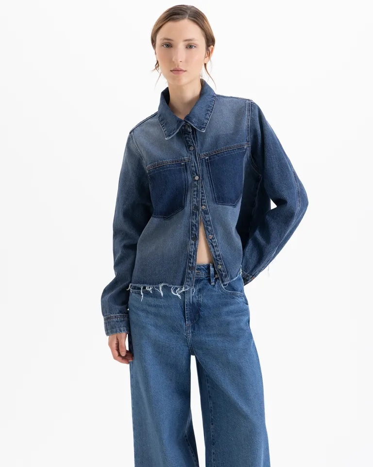 Camisa de denim con diseño de corte recto, cierre frontal con botones y detalle de bolsillos aplicados. Presenta un ruedo con acabado desmechado que le otorga un estilo informal y contemporáneo para combinar en cualquier ocasión diaria.