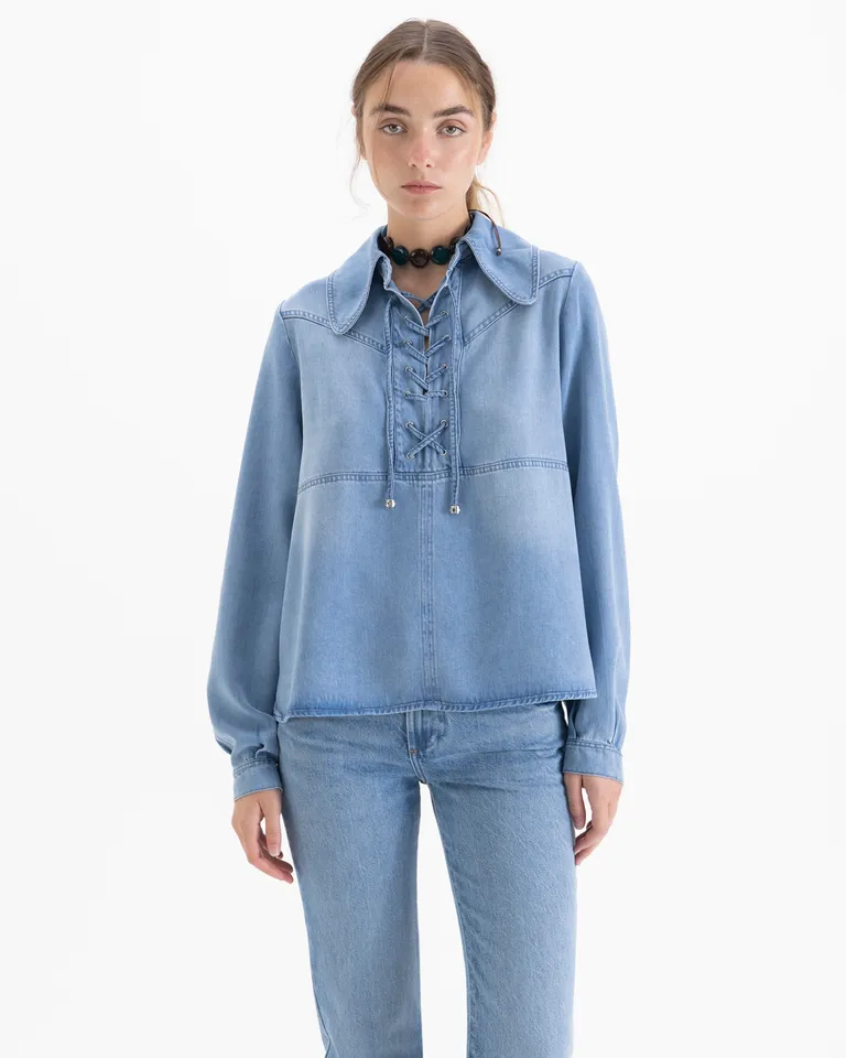 Camisa de manga larga con cuello clásico y detalle de cordón ajustable con ojalillos metálicos en el frente. Presenta un diseño de calce fluido y relajado, ideal para combinar en diversos conjuntos. Esta prenda destaca por su estilo versátil y su diseño funcional con ajuste en el escote.