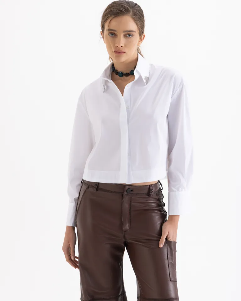 Camisa de corte clásico con cuello camisero, mangas largas con puños estructurados y cartera oculta con botones. Presenta un diseño versátil de largo a la cintura, ideal para combinar en diversos outfits. Incluye detalles metálicos decorativos en las puntas del cuello, aportando un toque distintivo a la prenda.