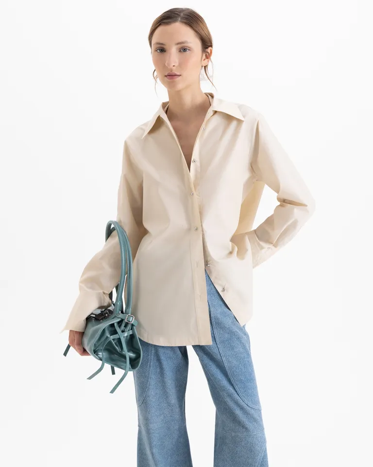 Camisa de corte clásico con largo hasta la cadera y mangas largas. Posee botones circulares en la parte frontal y en los puños, brindando un toque de distinción. Su diseño versátil permite múltiples combinaciones para diferentes ocasiones. Una prenda básica y funcional que se adapta cómodamente a diversas siluetas, ofreciendo una opción elegante y atemporal para el guardarropa femenino.