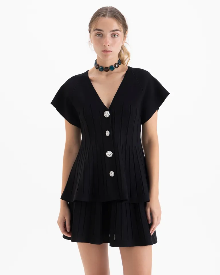 Cardigan con diseño de líneas, escote en V y cierre frontal mediante botones decorativos con detalles de piedras. Presenta una silueta ajustada con caída a la altura de la cadera, ideal para combinar en diferentes outfits. Diseño versátil de manga corta que ofrece comodidad y estilo para diversas ocasiones diarias.