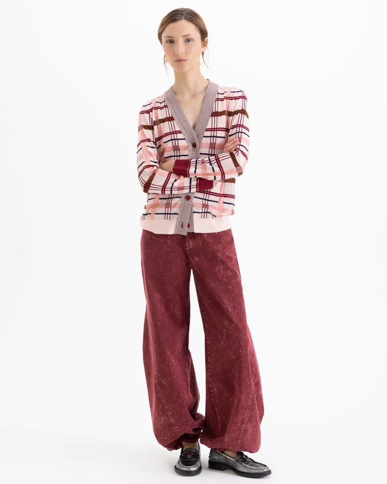 Cardigan de corte clásico con diseño a cuadros, cuello en V y cierre frontal con botones. Esta prenda presenta mangas largas y un largo a la altura de la cadera, ideal para combinar en outfits diarios. Un diseño versátil con detalles en los bordes que aporta estructura y estilo a cualquier conjunto casual o formal.