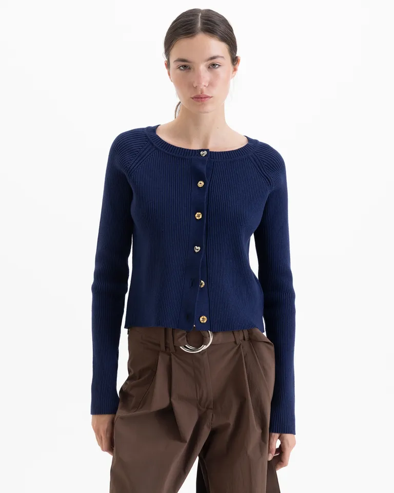Cardigan tejido con cierre frontal de botones y mangas largas con diseño entallado y escote redondo de Jazmin Chebar