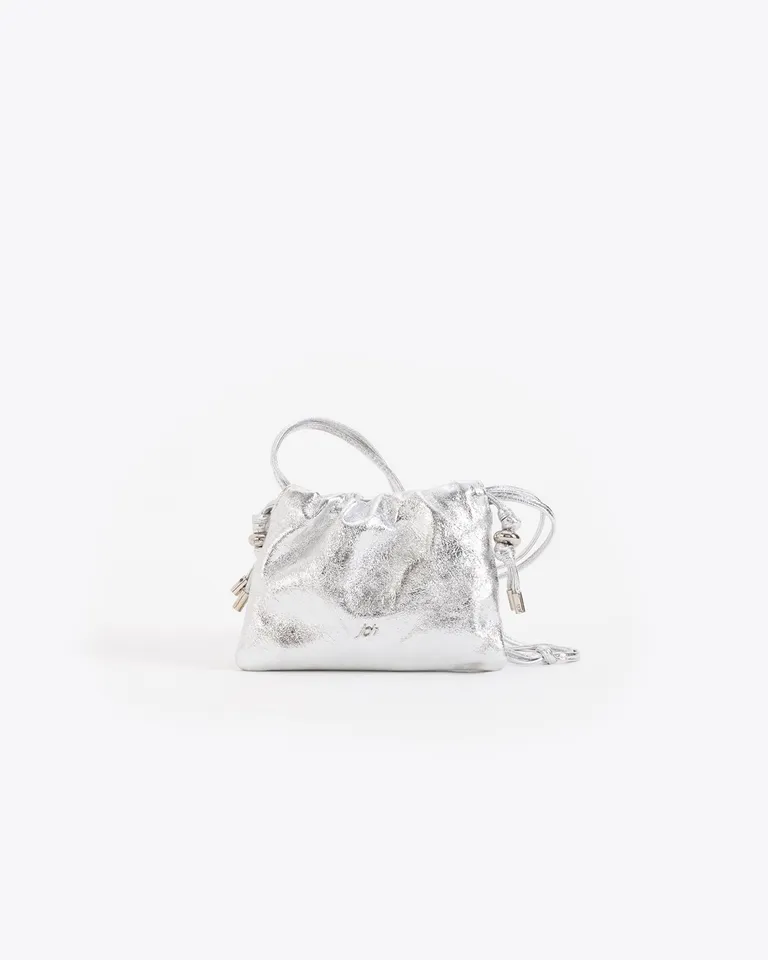 Esta elegante cartera mini en color plateado con diseño arrugado y detalles dorados es el accesorio perfecto para complementar tu look. Su tamaño compacto y prácticas correas ajustables la convierten en la opción ideal para llevar tus esenciales de manera cómoda y segura.