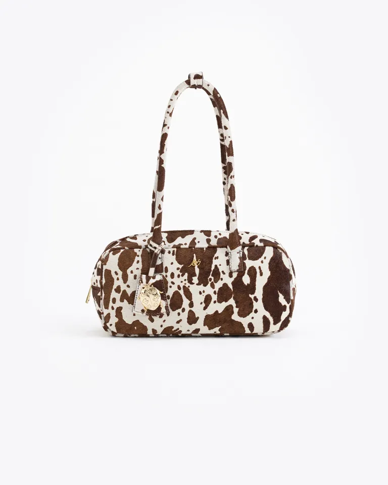 Cartera de formato rectangular con manijas cortas para llevar cómodamente en la mano o el hombro. Presenta un diseño con patrón distintivo en toda su superficie y cuenta con un detalle decorativo colgante en la parte frontal, integrando practicidad y un estilo versátil para completar cualquier conjunto.