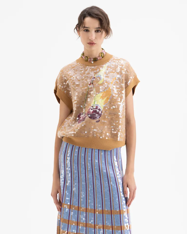 Chaleco de calce holgado con diseño bordado en el frente. Una prenda versátil ideal para sumar textura y detalle a tus outfits cotidianos. Cuenta con un diseño integral de lentejuelas que aporta brillo y movimiento, siendo una opción destacada para combinar con diversas prendas de tu guardarropa.
