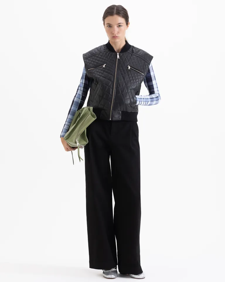 Chaleco con diseño matelaseado de líneas contemporáneas, ideal para incorporar en diversos conjuntos urbanos. Cuenta con cierre frontal, cuello tipo bomber y acabados en puño tejido en la cintura, ofreciendo una estructura definida y versátil para el día a día. Una prenda clave para sumar capas con estilo y comodidad en cualquier temporada.