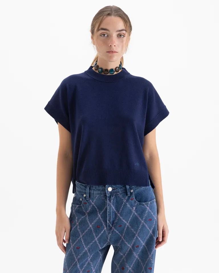 Chaleco de calce holgado y estructura amplia, caracterizado por sus hombros definidos y caída relajada. Presenta un diseño moderno que se proyecta hacia los laterales del frente, brindando una estética versátil y cómoda. Esta prenda es una opción ideal para superponer sobre camisas o vestidos, permitiendo integrar texturas a diversos conjuntos diarios.