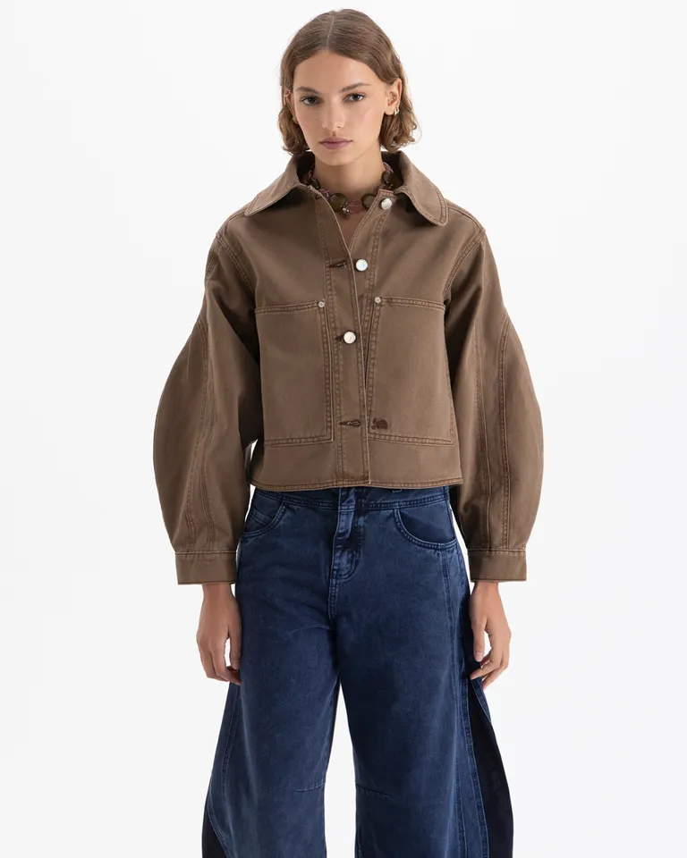Chaqueta de corte relajado con mangas redondeadas que aportan volumen. Presenta bolsillos plaqué en el frente y cierre mediante botones. Su diseño corto a la altura de la cadera la convierte en una opción versátil para combinar en looks urbanos y casuales.