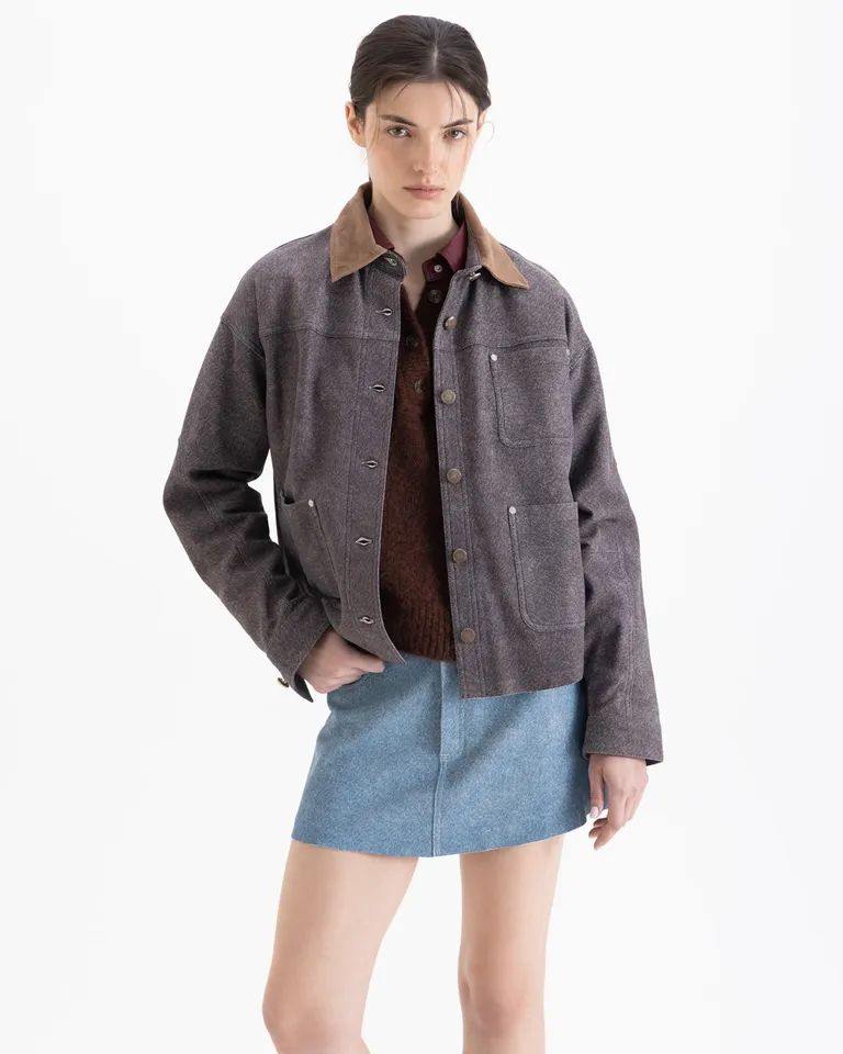 Chaqueta de diseño utilitario con cuello a contratono y bolsillos frontales. Presenta cierre con broches metálicos, brindando un estilo moderno y versátil. Una prenda ideal para elevar cualquier conjunto de temporada con un toque distintivo y actual, perfecta para combinar en capas gracias a su corte funcional.