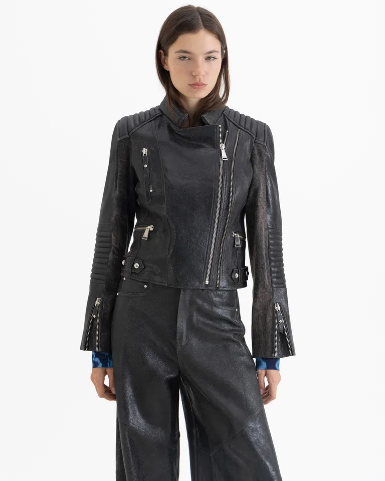 Chaqueta de diseño urbano con cierre asimétrico, detalles de cierres metálicos en bolsillos y puños, y secciones con textura en hombros y codos. Presenta una silueta ajustada ideal para complementar equipos informales o de noche. Una prenda versátil y atemporal que destaca por sus recortes estructurales y terminaciones cuidadas, ofreciendo un calce preciso para diversos usos diarios.