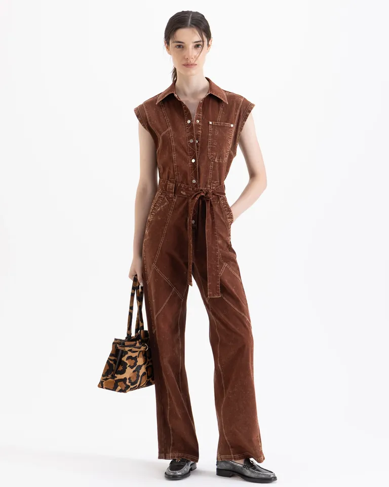 Enterito largo sin mangas con cuello y cartera camisera. Presenta un diseño versátil con lazo ajustable en la cintura, botones metálicos y detalles de remaches. Ideal para lograr un look sofisticado y cómodo en cualquier ocasión gracias a su calce relajado y estilo contemporáneo.