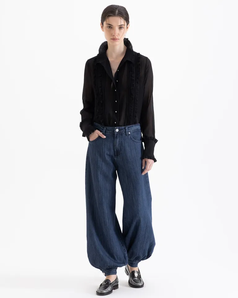 Jeans con silueta estilo balloon que destaca por su volumen. Presenta ajuste mediante botón en la zona del tobillo, ofreciendo un diseño distintivo. Cuenta con bolsillos laterales y cierre frontal clásico. Una prenda versátil para armar conjuntos informales o elegantes con un calce cómodo y moderno.