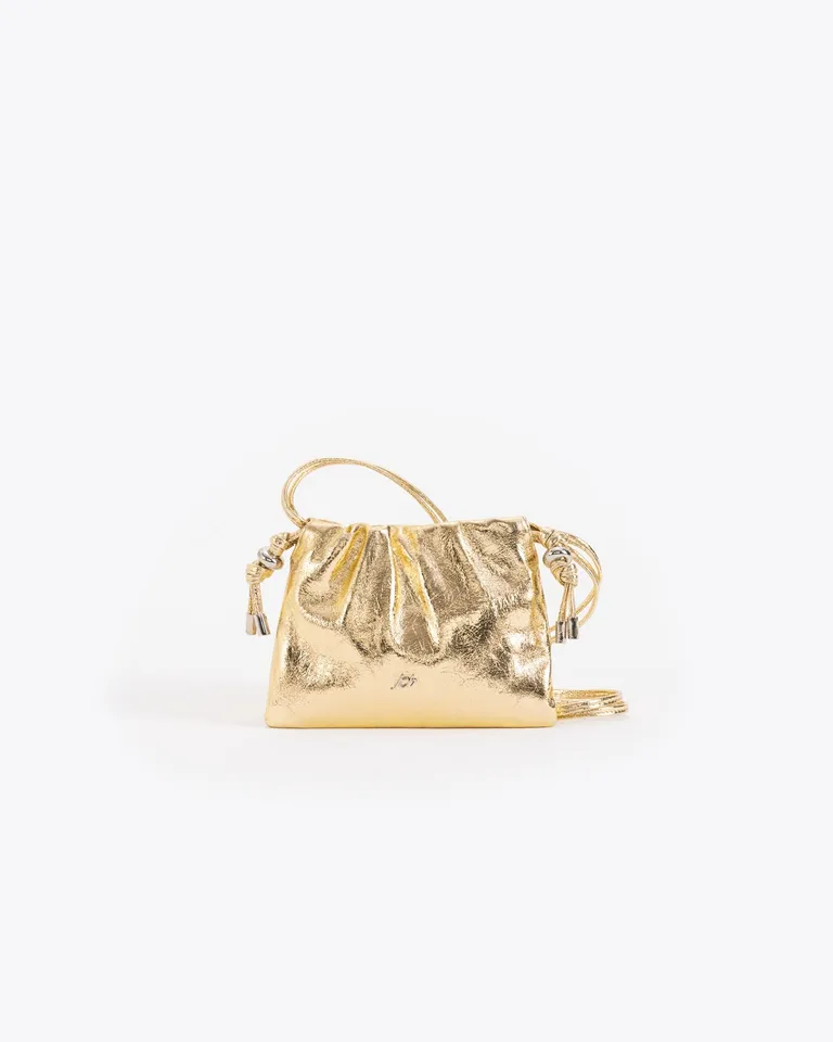Elegante mini bag con acabado metalizado brillante y diseño arrugado que aporta textura única. Cuenta con detalles distintivos en sus punteras y un tamaño perfecto para llevar lo esencial. Sus correas ajustables permiten versatilidad en el uso, ideal para ocasiones especiales o para elevar un look casual.