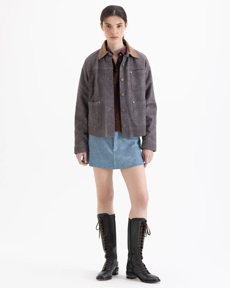 Mini falda con diseño de inspiración urbana y moderna. Presenta bolsillos plaqué en la parte posterior, detalle de remaches tipo jeaneros y acceso frontal con cierre y botón metálico. Una prenda versátil ideal para combinar en diversos outfits cotidianos.