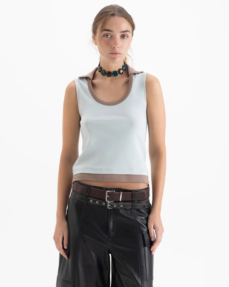 Musculosa de corte ajustado con cuello redondo y detalles en contraste en el ruedo y escote. Presenta un diseño versátil ideal para combinar en diferentes outfits urbanos y modernos. Una prenda básica esencial para renovar el guardarropa con estilo y comodidad.