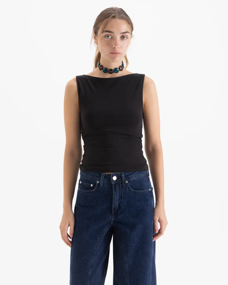 Musculosa entallada sin mangas con corte al cuerpo y detalle bordado en la espalda de Jazmin Chebar