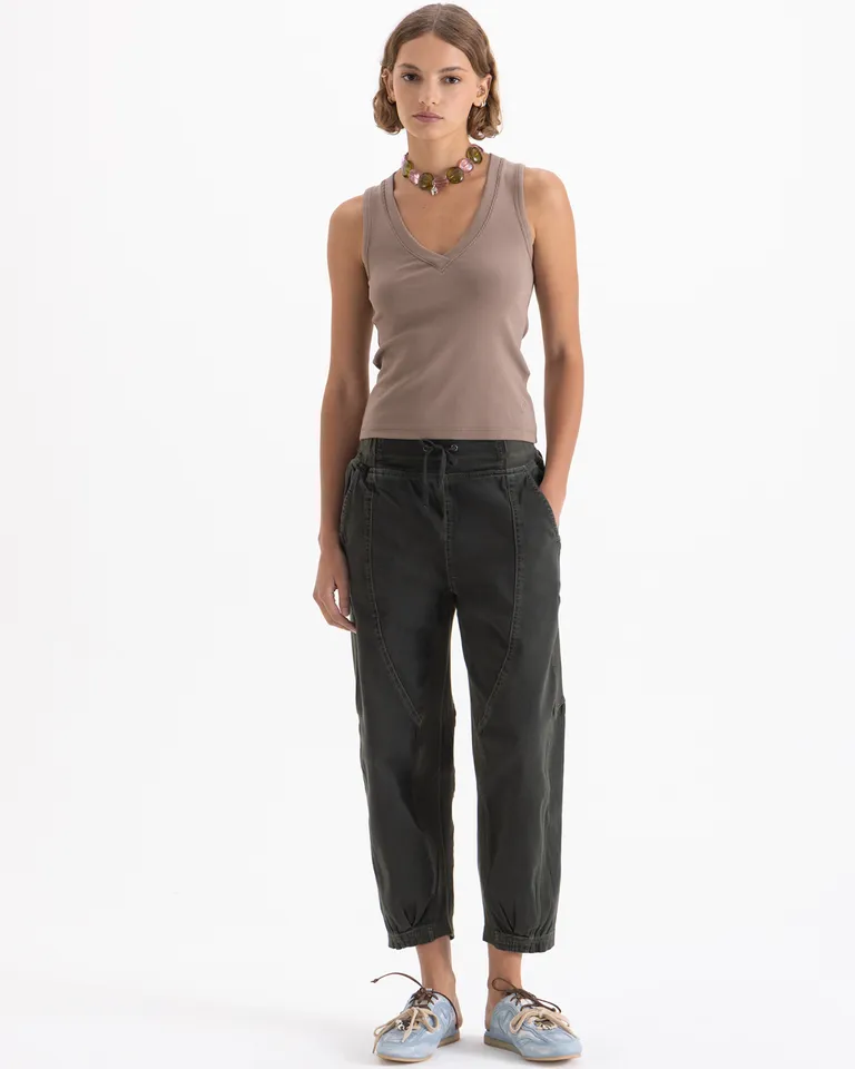 Pantalón tipo babucha de tiro medio con cintura elastizada y ajuste al tobillo. Presenta un diseño relajado con bolsillos diagonales en el frente y bolsillos plaqué en la parte posterior, ideal para quienes buscan comodidad en el uso diario. Presenta una silueta versátil que se adapta a diferentes ocasiones.