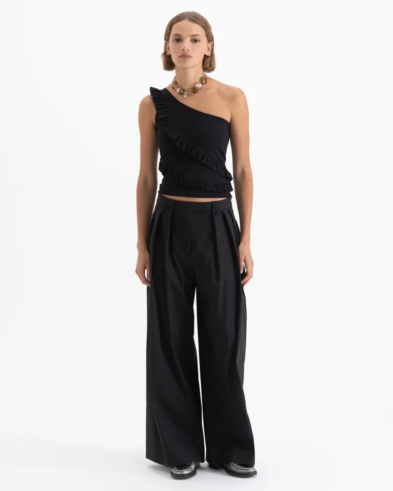 Pantalon de corte holgado con diseño de doble tabla en el delantero. Presenta un cierre frontal con gancho y botón interior, bolsillos laterales prácticos y bolsillo ojal en la parte posterior con terminación de ruedo invisible. Una prenda versátil de tiro alto que se adapta a diversos estilos, ideal para lograr una silueta cómoda y elegante en cualquier ocasión.
