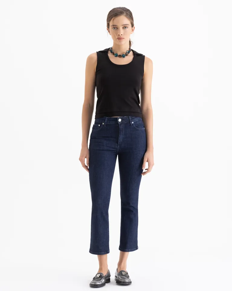 Pantalón de corte cropped con tiro medio y un sutil ensanchamiento en la botamanga. Este modelo presenta un largo que llega por encima del tobillo, ideal para combinar con diversos estilos de calzado. Una prenda versátil para el uso cotidiano que ofrece comodidad y un ajuste preciso a la silueta.