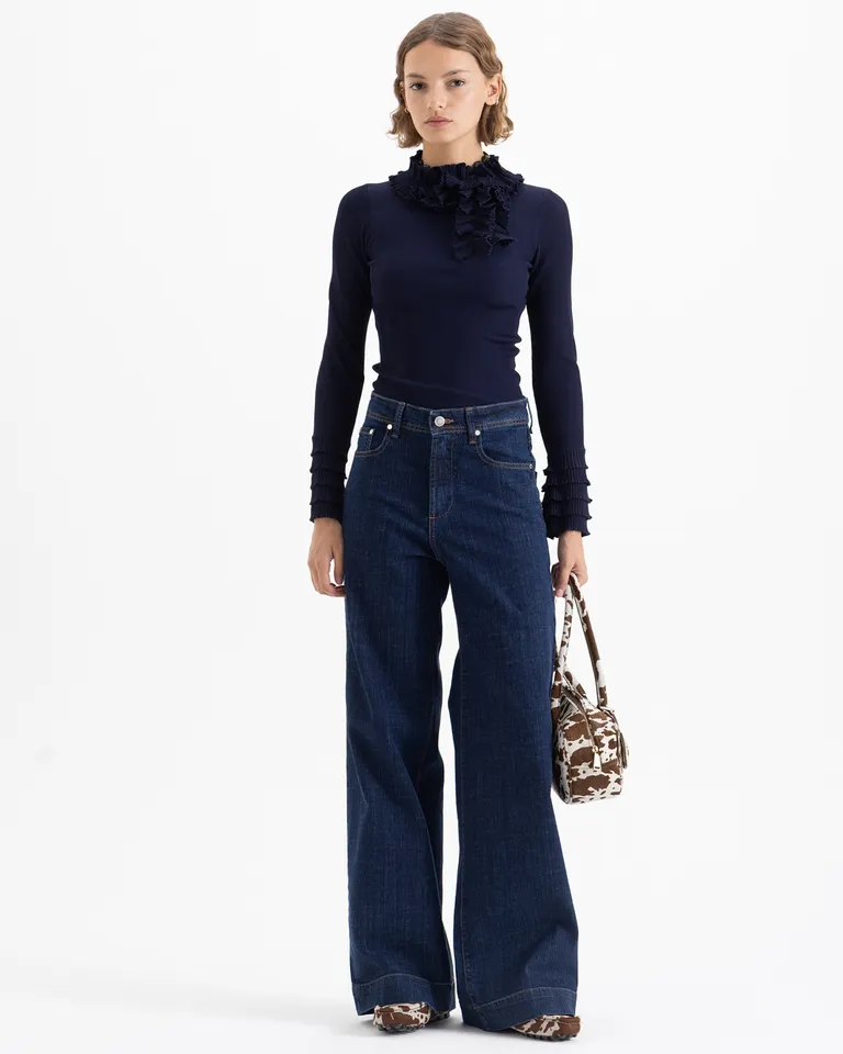 Pantalón de jean con diseño de pierna ancha y tiro medio. Su silueta amplia ofrece una caída fluida y un estilo contemporáneo, ideal para integrar en conjuntos informales o más formales. Presenta un diseño clásico con acabado uniforme, permitiendo diversas combinaciones en cualquier temporada del año gracias a su estructura versátil.