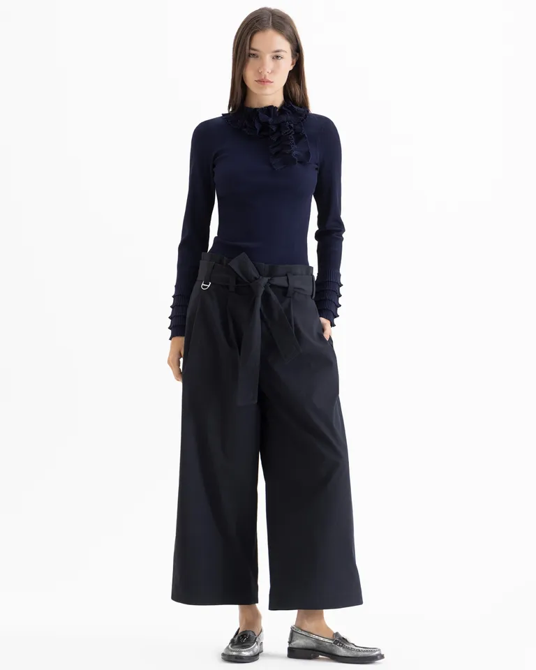 Pantalón de tiro alto con diseño wide leg y largo cropped. Presenta una cintura estilo paper bag con tablas encontradas, lazo ajustable y pasador metálico decorativo. Incluye bolsillos laterales ocultos, ofreciendo un calce cómodo y versátil para diversos outfits.