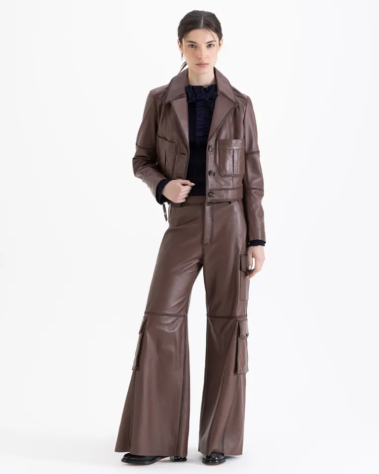 Pantalon de diseño holgado con silueta amplia en el ruedo. Cuenta con recortes decorativos en la parte frontal y trasera, e incorpora bolsillos laterales de gran capacidad tipo cargo. Incluye un cinturón ajustable con hebilla metálica, ideal para un look versátil y actual.