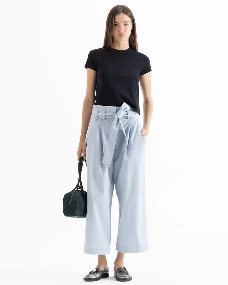 Pantalón de tiro alto con diseño paper bag y silueta amplia de corte cropped. Incluye detalle de lazo ajustable en la cintura, bolsillos laterales ocultos y presillas decorativas. Una prenda versátil de estilo relajado y moderno, ideal para completar outfits urbanos y sofisticados.